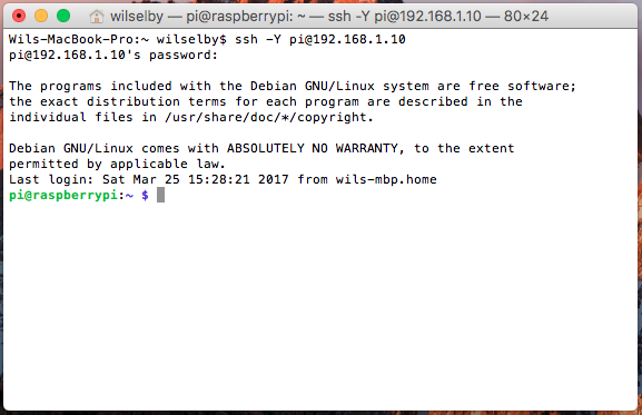 Once connected, you will be asked for the password associated with the pi username. On Raspbian the default password is raspberry. If successfully logged in, your prompt should now be the same as the prompt on the Raspberry Pi.