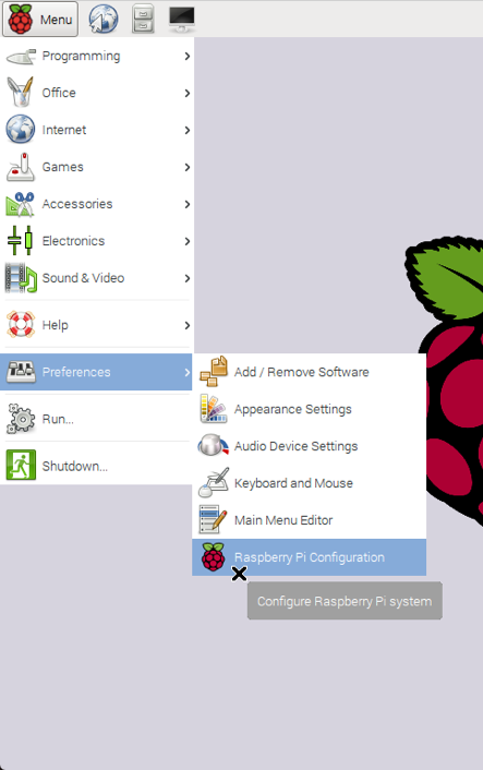 First, go to the Raspberry Pi Configuration tool under the “Preferences” section of the Main Menu.