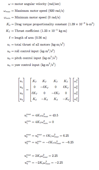 It is also important to place limits on the control inputs that can be calculated by the control system. These control inputs are converted into motor speeds that are then sent to the ESCs and eventually the motors. Therefore, we don’t want to use control gains that result in desired motor speeds that are not possible on the actual system. The computations of the control limits are depicted below based on the physical system.