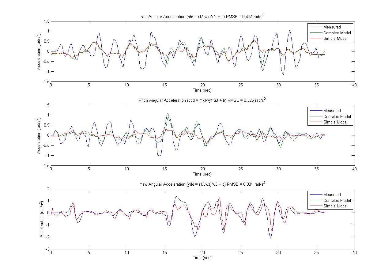 While these equations simplify the control design and analysis process, we can still use the more accurate, non-linear equations of motion in the simulated environment to assess the robustness of our control system. Note that in the final equations, translational movement has been decoupled from attitude assuming the heading remains around 0 degrees. Movement along the global x and y axis can be controlled by independently changing the roll and pitch values. Also, for the quadrotor to maintain a stable altitude, the net thrust vector divided by the quadrotor’s mass must be equal to the acceleration due to gravity. The figures below compare the simplified model derived above with the complex model and ground truth measurements described in the Model Verification section. While note as accurate as the non-linear model, the linearized model does compare well to the ground truth. The assumptions needed to linearize the model are validated and the model can be used as a basis for control system design.