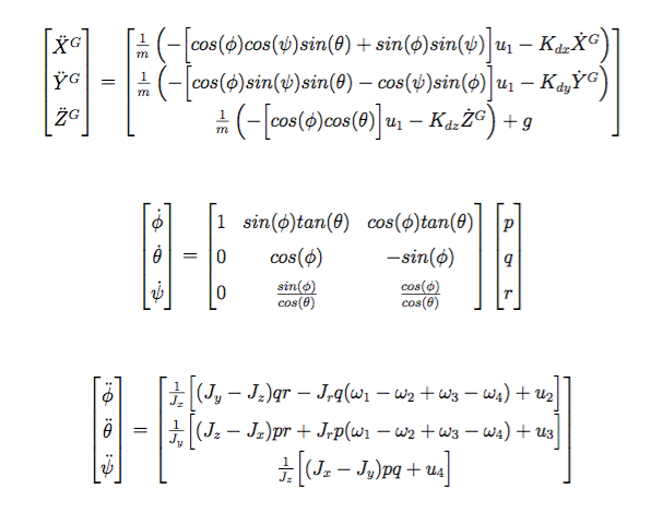 The complex model of the quadrotor’s motion make it difficult to gain accurate insight into the quadrotor’s behavior and to troubleshoot control systems in simulation. For this research, only the primary elements that describe the quadrotor’s behavior at hover, our desired operational state, are considered. The elements that significantly impact the quadrotor’s behavior at high speeds are ignored. We can make several assumptions that reduces the complexity of the non-linear equations described above to develop basic control strategies. We can then increase the complexity of the system model to develop more precise control systems in the future. The model derived in the System Modeling section is reproduced below with the control inputs introduced.