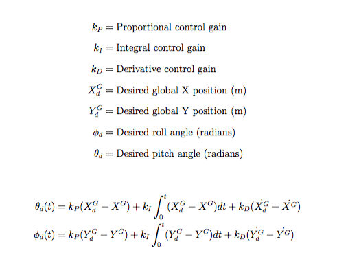 Controlling the altitude is analogous to controlling the total thrust of the quadrotor. This is important since this control input also influences movement along the x and y axis. This can be seen in the translational equations of motion where u1 is an input in the x and y directions. Therefore, higher values of throttle result in more aggressive movements in the x and y directions given constant roll and pitch angles. In our simplified model, vertical acceleration is decoupled from attitude angle. However, this doesn’t hold when the quadrotor rotates since components of vertical acceleration are also in the x and y planes. Therefore, the altitude control compensates for both the offset of gravity and the deflection of the generalized thrust vector due to tilt. The full PID controllers are detailed below.